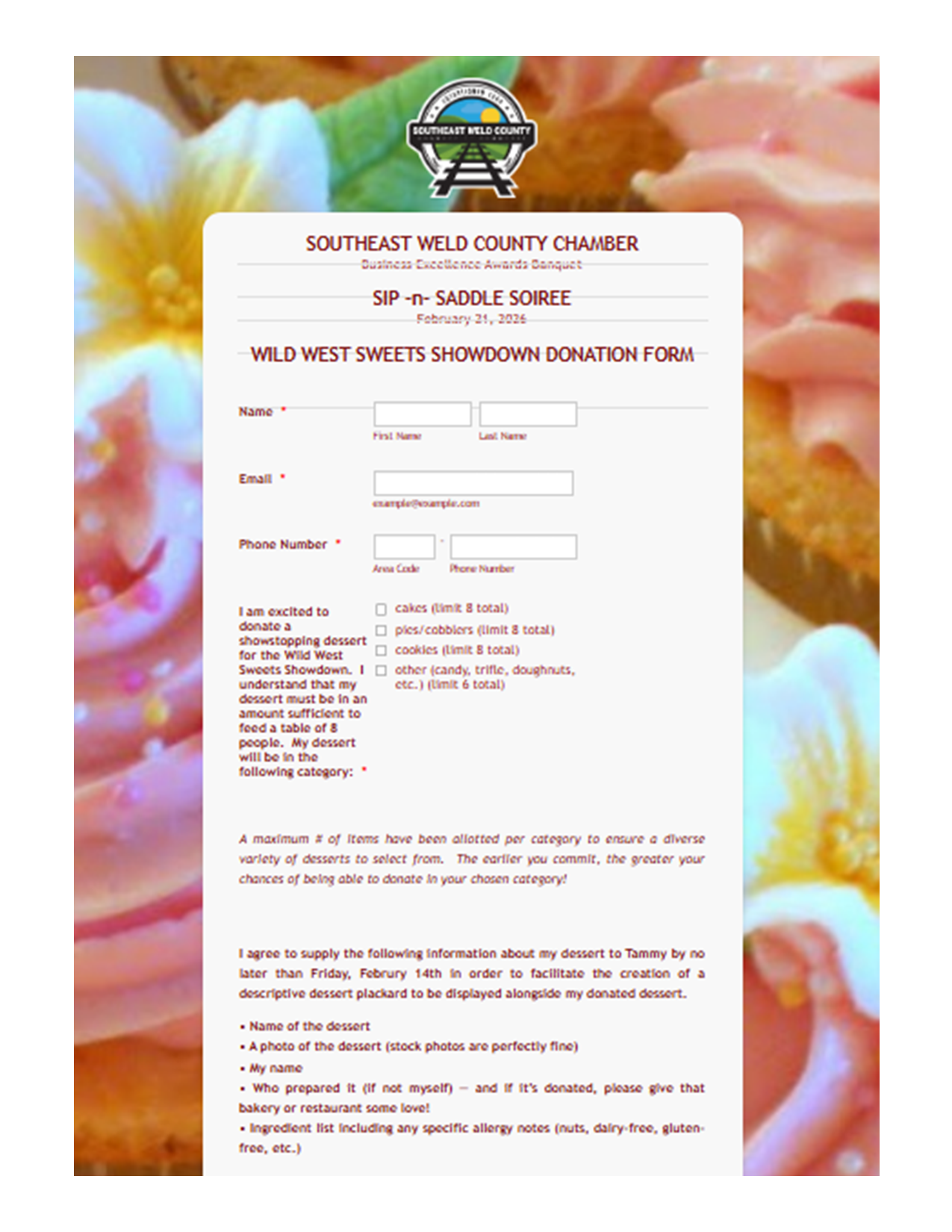 Not to be missed is this networking event of the year for the southeast region of Weld County and the western region of Morgan County. Returning this year are the much loved silent and live auctions, but we're also adding some fun new things to the mix that may just become well-loved traditions too! See below for more information on the Wild West Sweets Showdown and Bail Out for a Cause campaigns, then click on the photo links to be taken to the registration form for each.