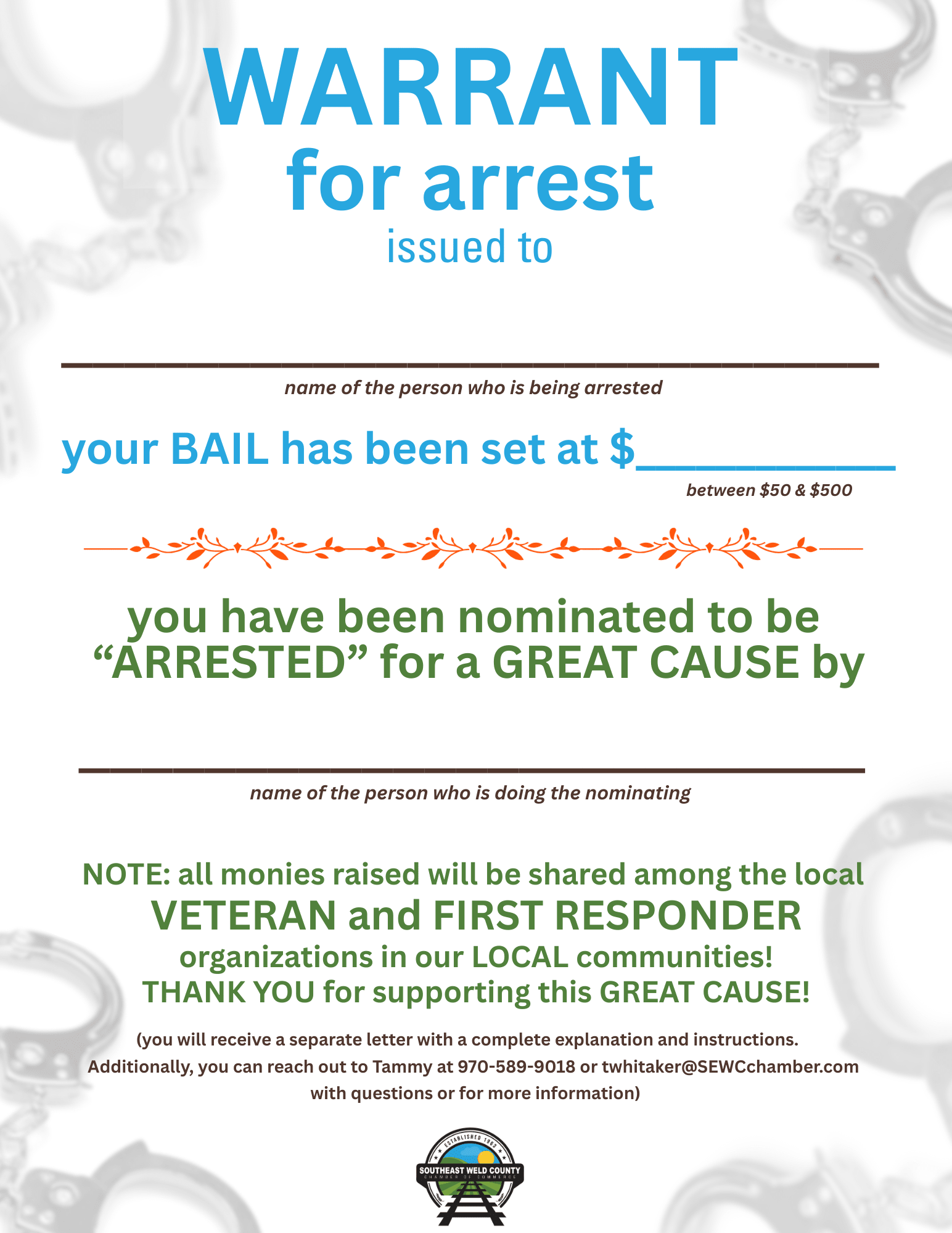 BAIL OUT FOR A CAUSE: Nominate your spouse, your boss, your co-worker or even your business rival to be "locked up" and set their bail amount (between $50 - $500). They will need to either raise that bail through donations or pay the bal amount themselves. They'll bring their bail money to the banquet and give it to the bailiff. Once they post their bail, their "WANTED" poster will be removed from the jailhouse display, then have their photo taken for our arrest records and local media publication. All proceeds will directly benefit the Veteran and 1st Responder organizations in our local communities.